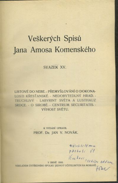 | Poznámka | obsahuje: Listové do nebe / Přemyšlování o dokonalosti křesťanské / Nedobytelný hrad / Truchlivý / Labyrint světa a Lusthauz srdce / O sirobě / Centrum securitatis / Výhost světu |